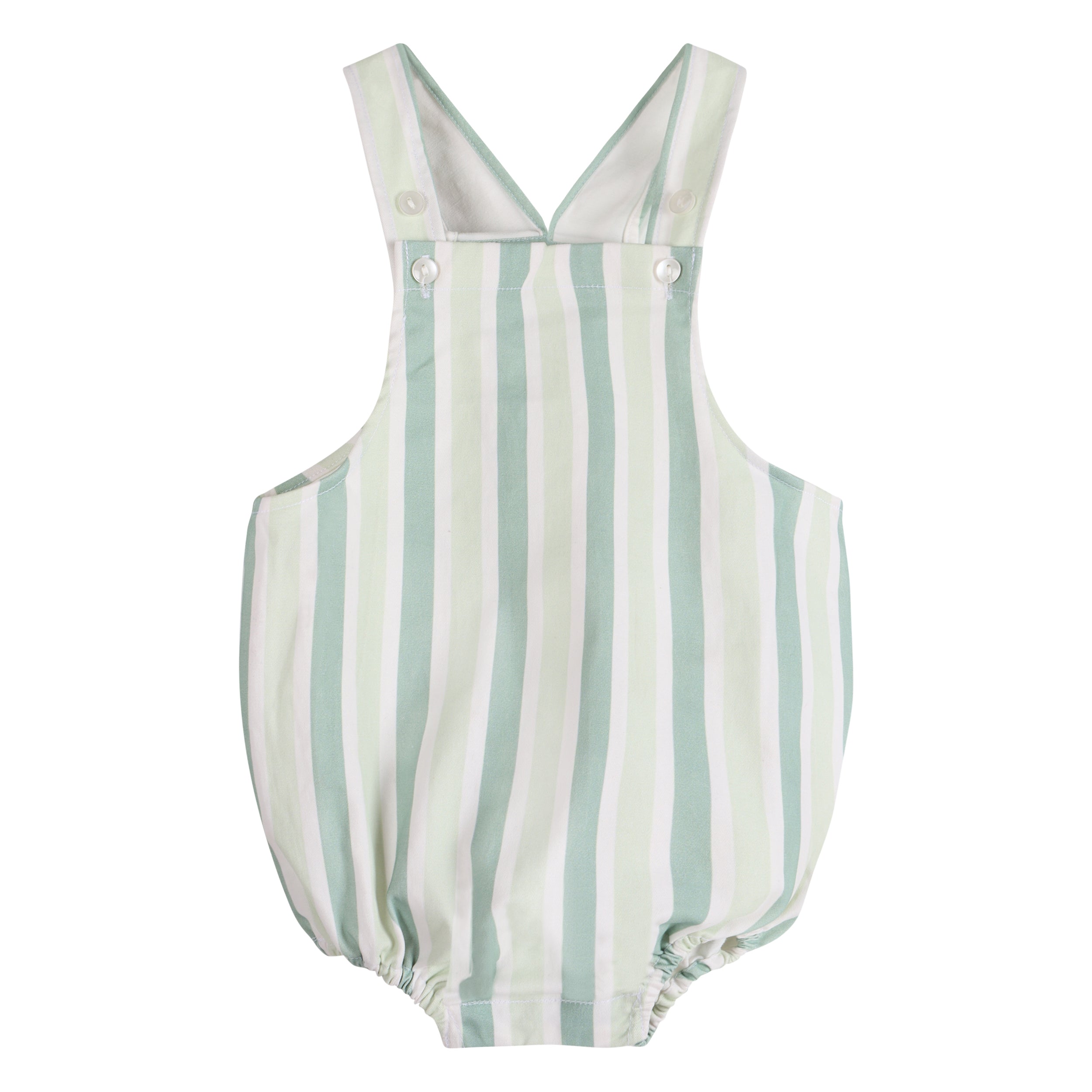 - Features wide straps and a bubble silhouette, with soft vertical stripes, elastic leg openings, and a snap button closure for easy changes.